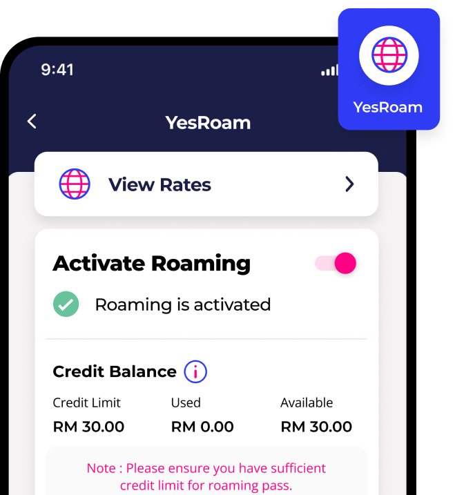 Activate 'International Roaming Service' from the YesRoam quick access.